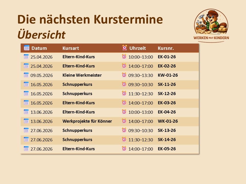 Werkkurse in Mannheim - hier haben Kinder ab 4 Jahren die Möglichkeit, mit echten Werkzeugen die Welt des Holzes zu entdecken. Schnupperkurse, Eltern-Kind-Kurse, Kurse für kleine Werkmeister und noch viel mehr - hier ist für jeden etwas dabei.