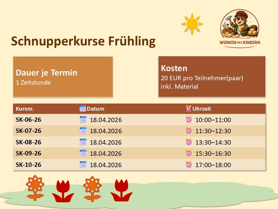 In den Schnupperkursen hast Du die Möglichkeit, eine Stunde lang in die Welt des Handwerks einzutauchen und herauszufinden, ob Du Spaß am Werken mit Holz hast.